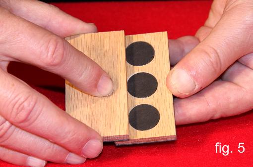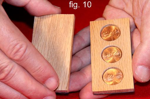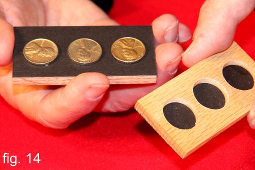 | Two rectangular thin boards are displayed front and back. One contains three ¾ inch holes and the other is flat with no holes. The boards are placed together and when separated, a penny appears in each of the three holes. Another three pennies then appear on the flat board. Finally, three more pennies are produced with the wave of the hand. Two versions taught. One with minimal sleight of hand and one with no sleights. |