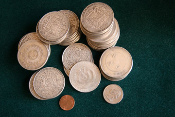 | 4 Dollar-size antique Chinese coins. Price: $20.00 including International Air Mail Shipping. For greater than ten I will quote you a shipping price |